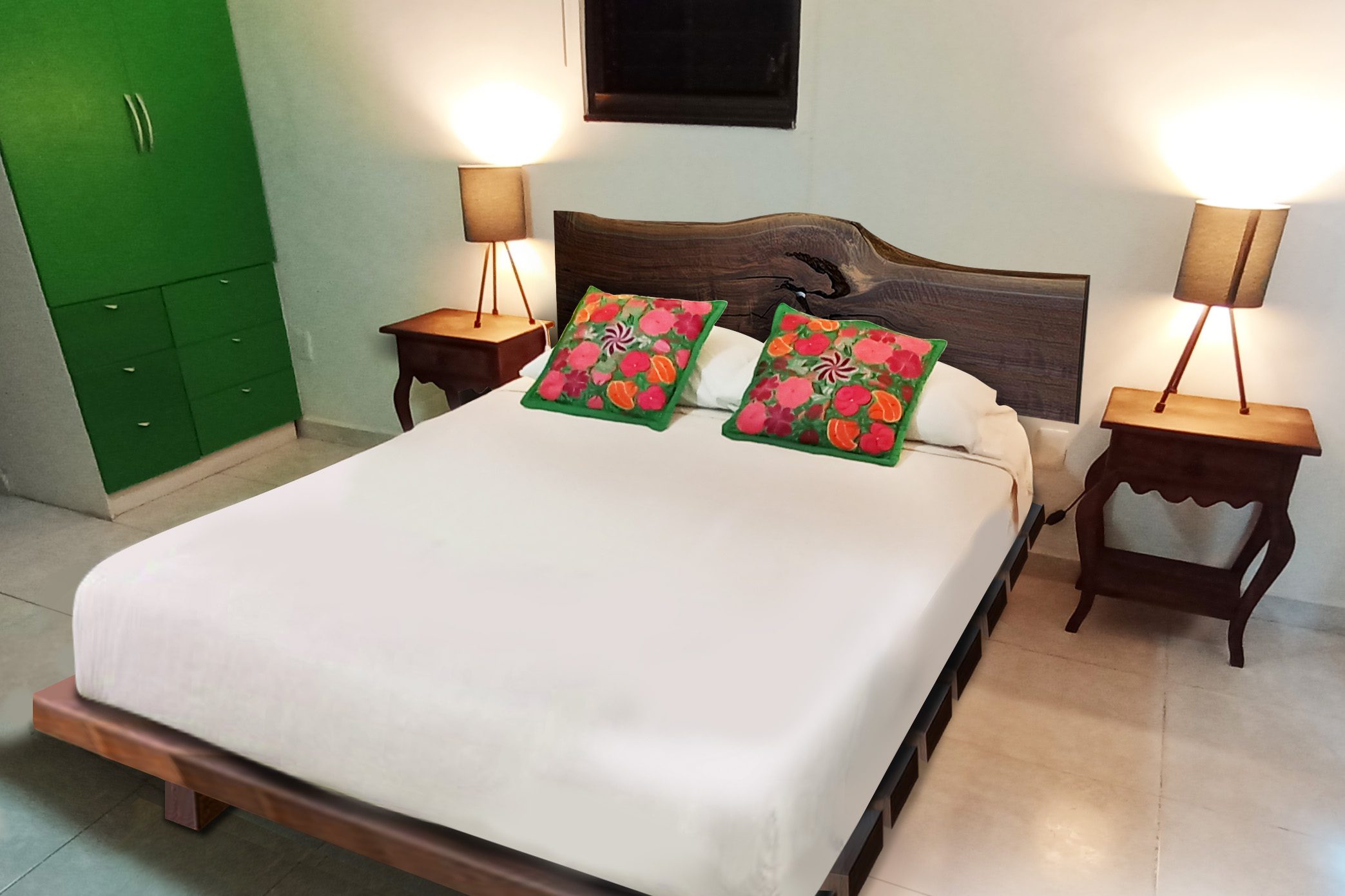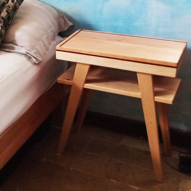 Contemporáneo diseño bicolor en madera de Pino con incrustaciones de Zapote, suave al tacto gracias a nuestro único y delicado acabado con aceite de linaza y cera de abeja.